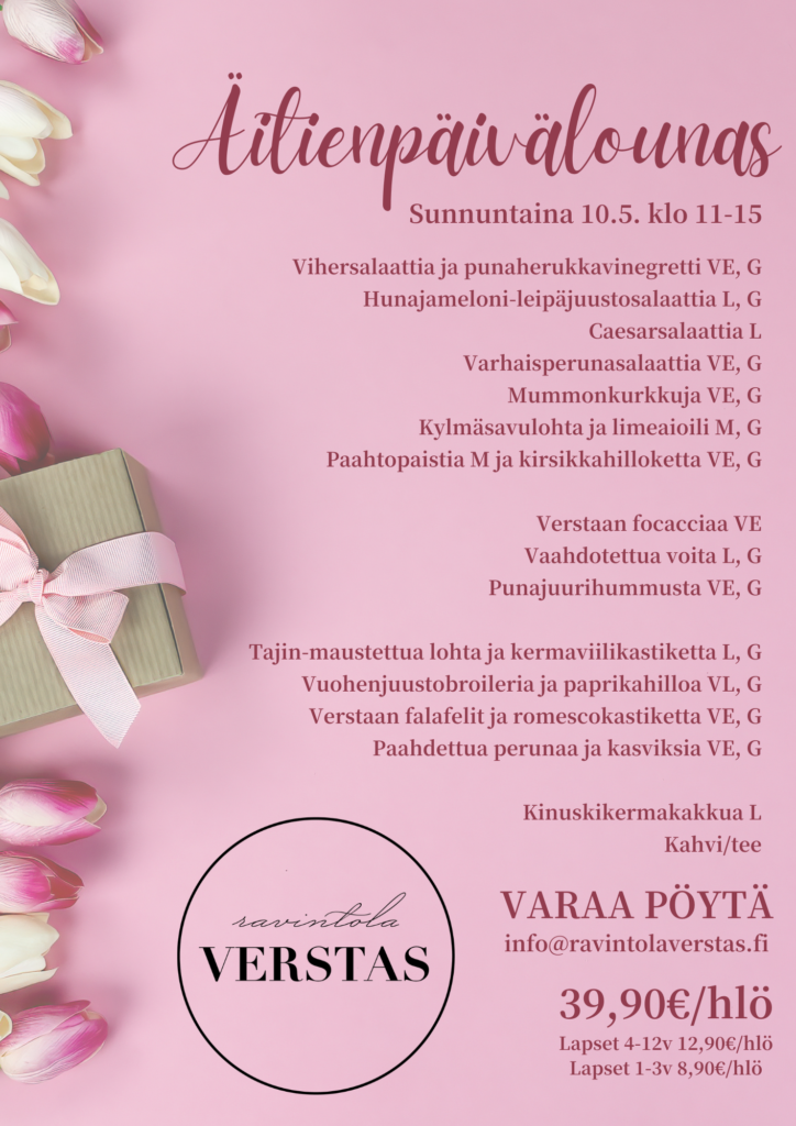 Sunnuntaina 10.5.2026 klo 11 – 15 Varaa pöytä: info@ravintolaverstas.fi Äitienpäivälounaan hinta 39,90€/hlö Lapset 1-3v: 8,90€ Lapset 4-12v: 12,90€