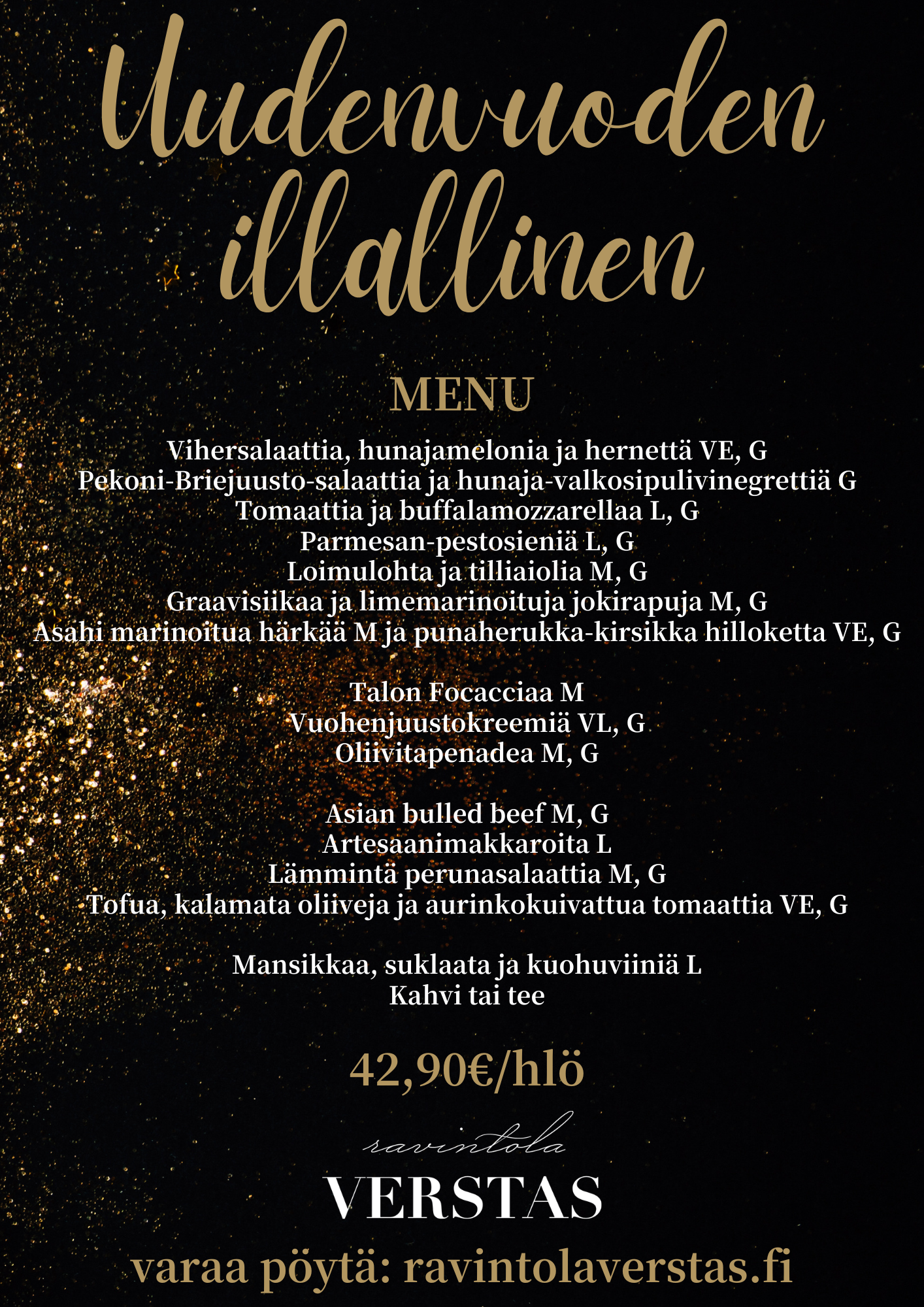 Keskiviikkona 31.12.2025 klo 18.00 – 21.00 Varaa pöytä: info@ravintolaverstas.fi Kattaukset 18.00, 18.30 & 19.00 alkaen